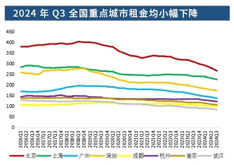 租金仍呈现下跌趋势,以价换量仍为市场主流。由于市场供大于求局面愈发显著,企业对租金折扣高度敏感,2024年以来全国主要城市的租金普降,且整体降幅不断扩大。