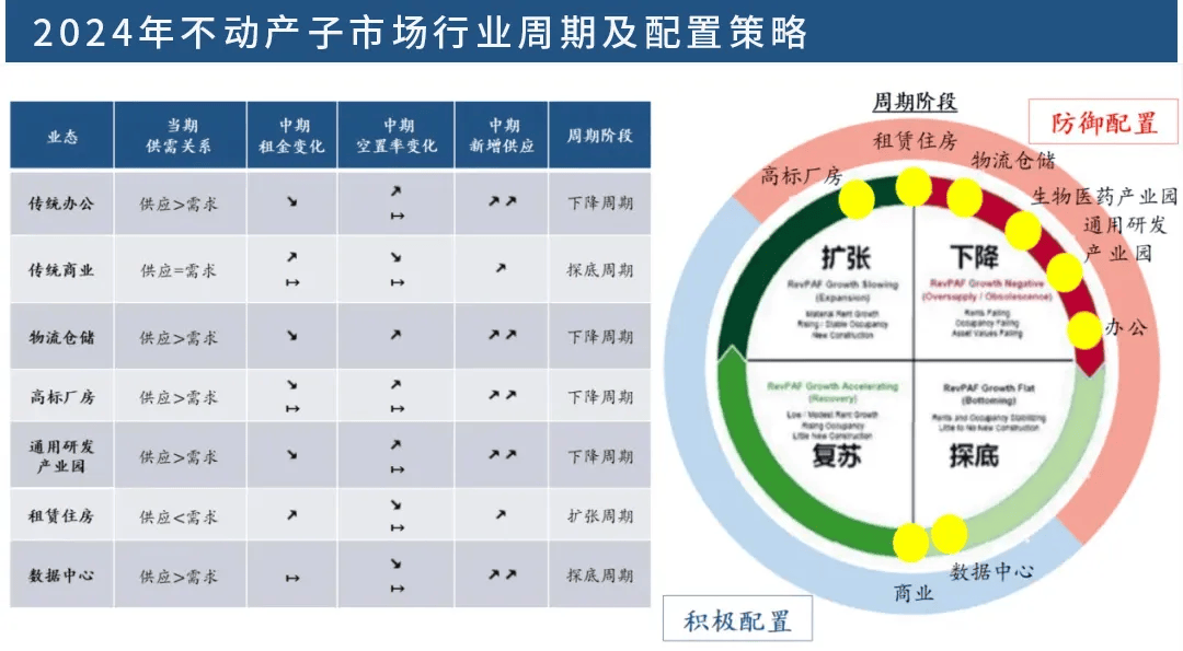根据办公(含研发类)、零售、数据中心、仓储物流、租赁住房的各子市场所处行业周期的不同,选择积极配置或防御配置。