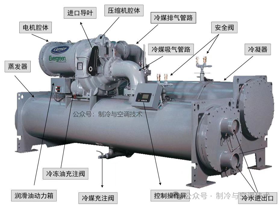 水冷螺杆机组是一种以螺杆压缩机为核心的高效制冷设备,广泛应用于中央空调系统和工业制冷领域。其工作原理基于蒸汽压缩式制冷循环,通过四个核心过程(压缩、冷凝、节流、蒸发)实现热量转移,以下是详细解析: